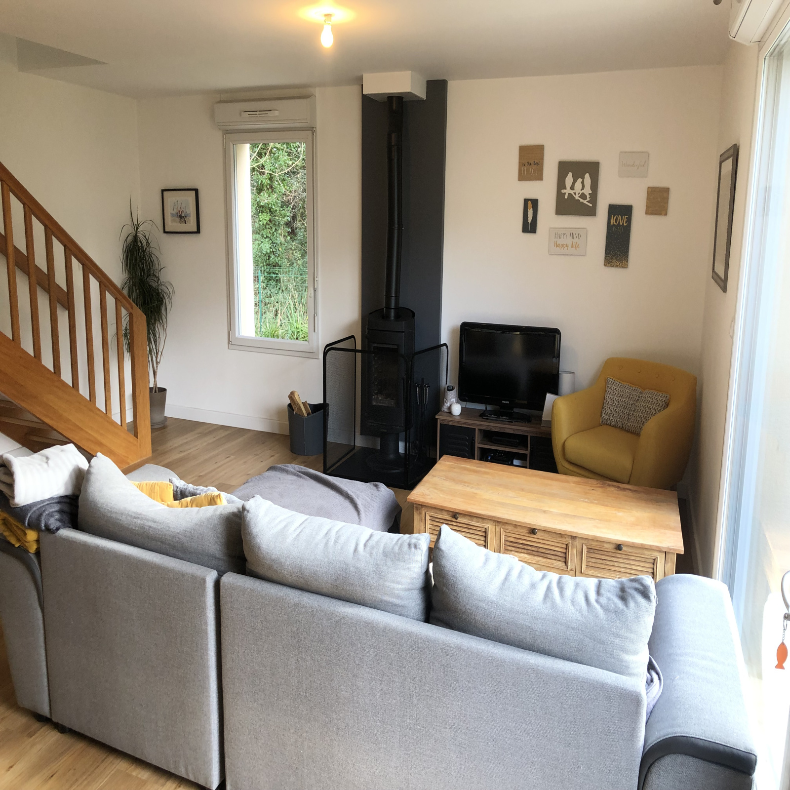 - Au rez-de-chaussée : d'une belle entrée, d'un séjour avec un poële. Cette lumineuse pièce de vie permet l'accès à la terrasse plein sud, sans vis à vis. La cuisine aménagée et équipée est ouverte. Le sanitaire est équipé d'un lave-mains.