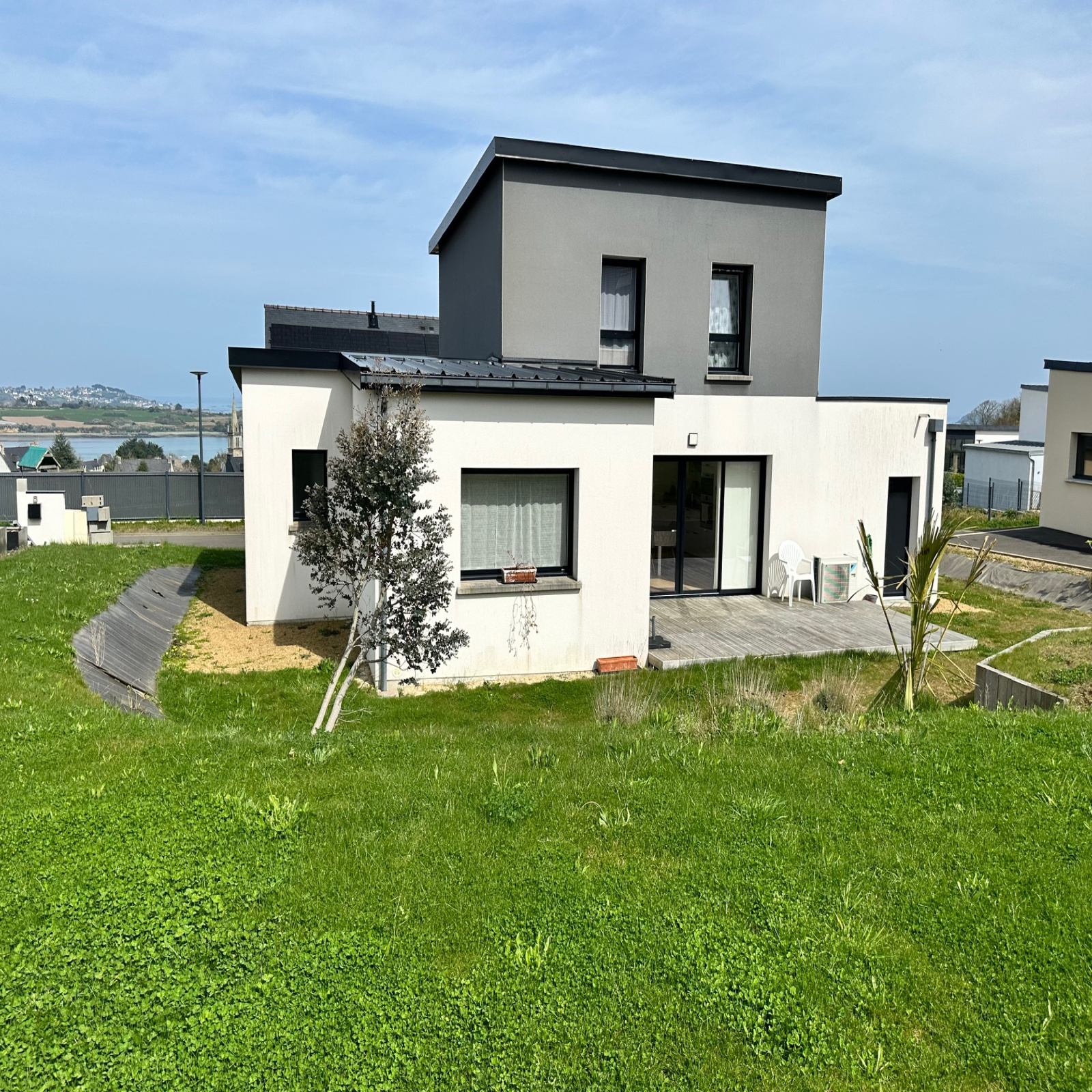 COMMEREUC IMMOBILIER vous propose d'acquérir une jolie maison contemporaine, 4 pièces avec garage et jardin, construite en 2019 au coeur d'un quartier résidentiel. Cette maison économe en énergie se compose au rez-de-chaussée d'une belle pièce de vie d'environ 40 m² ouvrant par des baies coulissantes, au Sud, sur la terrasse et le jardin. Son lumineux séjour accueille, salon, salle à manger, cuisine aménagée/équipée. Toujours en rez-de-jardin, un espace nuit avec une chambre parentale et sa salle d'eau privative. Le sanitaire est séparé. A l'étage, le palier/mezzanine dessert deux chambres dont une avec vue sur la baie de PAIMPOL, une salle de bains, un WC. Visites uniquement sur rendez-vous en contactant l'Agence COMMEREUC IMMOBILIER PAIMPOL au 02 96 20 89 66.