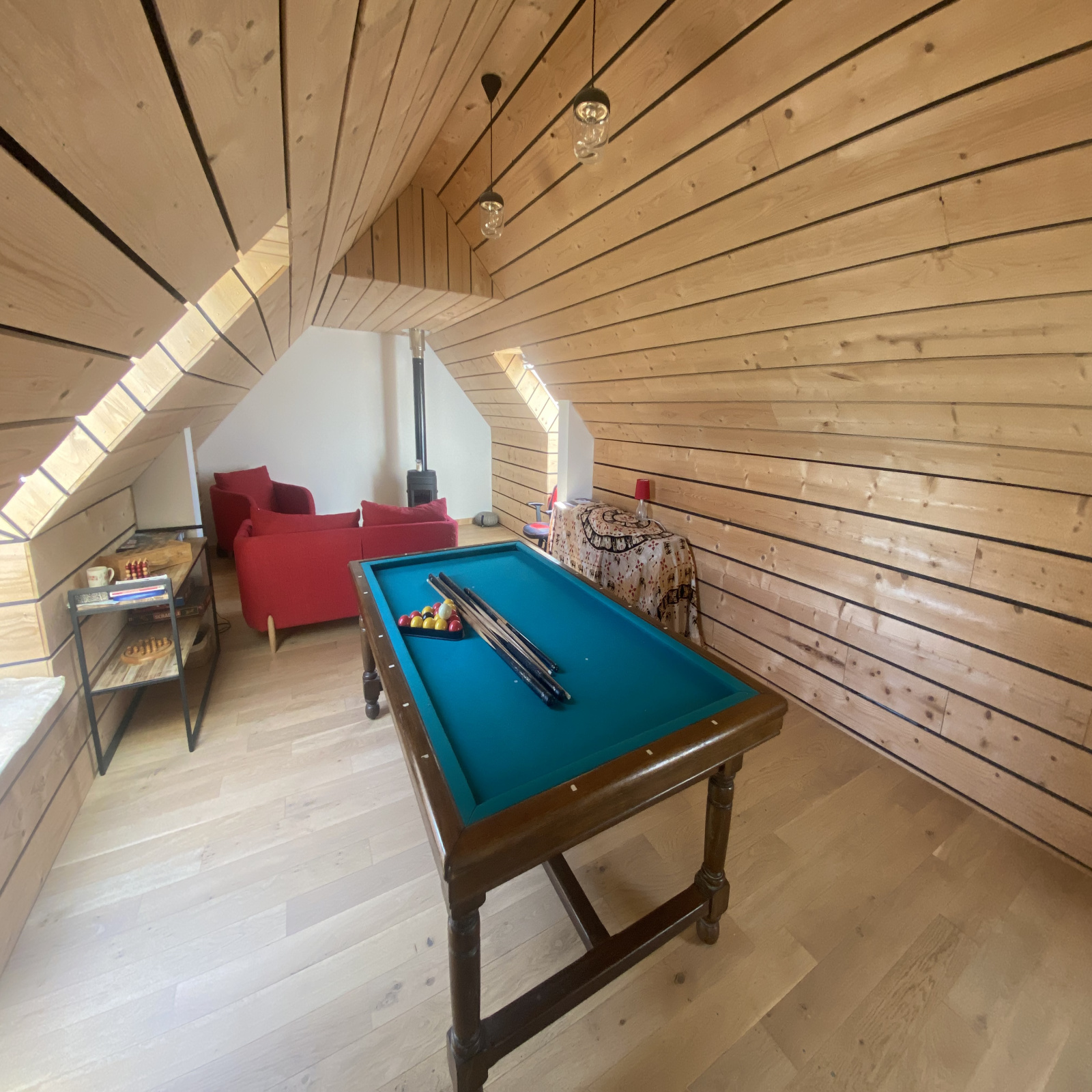 - le rez-de-chaussée se compose d'une entrée, une chaufferie, une buanderie, un sanitaire avec lave-mains, une cuisine aménagée/équipée, une salle à manger, un salon avec cheminée, une chambre avec salle d'eau privative, un bureau et à l'étage une salle de jeux avec son poêle à bois.