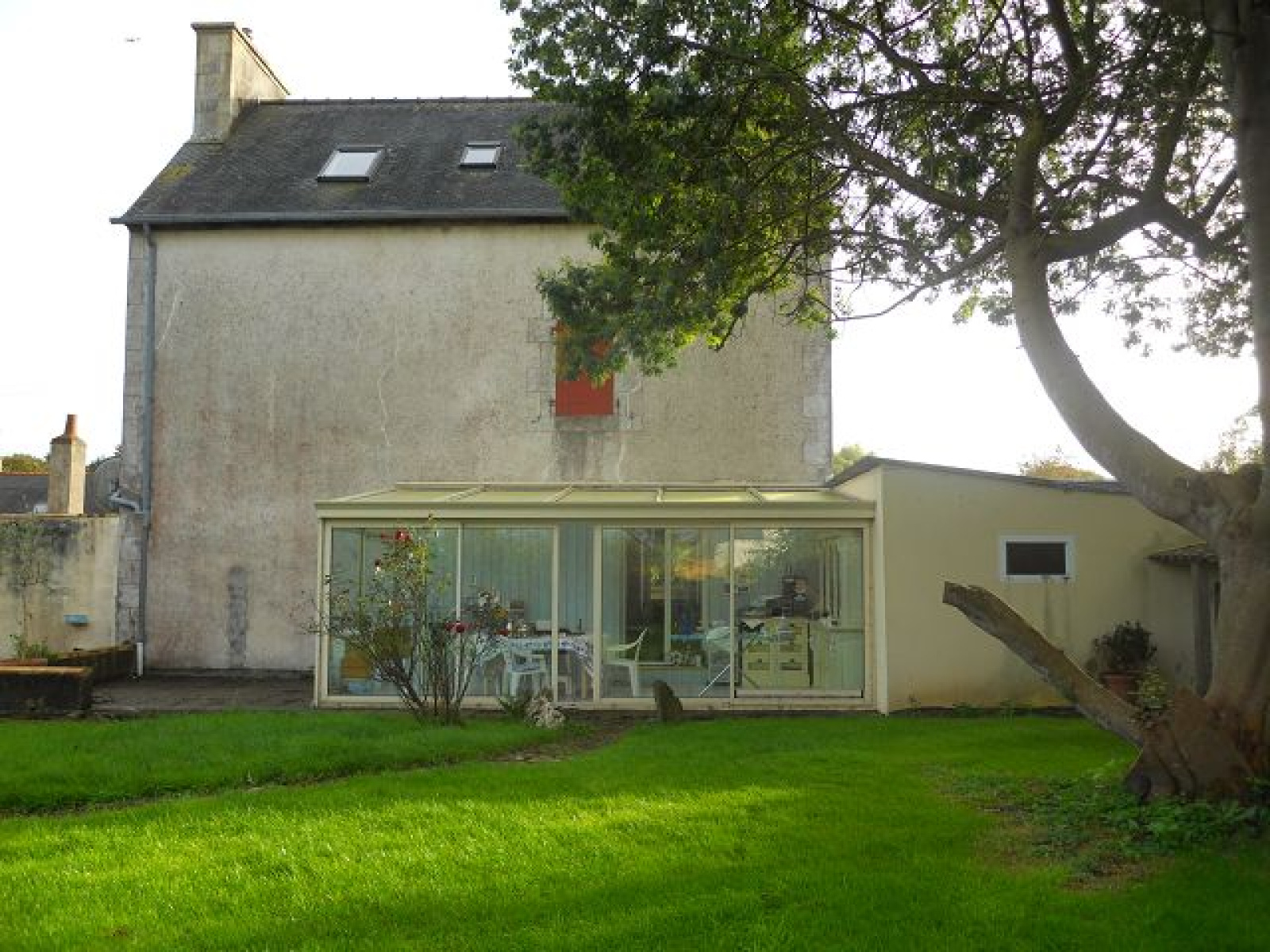A PROXIMITE DU BOURG DE PLOUEZEC ET DE SES COMMERCES... Jolie maison traditionnelle en pierres située entre le bourg et la mer : le rez-de-chaussée se compose d'une belle pièce de vie de 40 m2 avec cheminée, véranda donnant sur le jardin clos de murs, cuisine aménagée, buanderie, WC avec lave-mains. Au 1er étage deux chambres et salle d'eau. Deux autres chambres sous les combles. Garage avec débarras - Jardin clos de mur en pierres