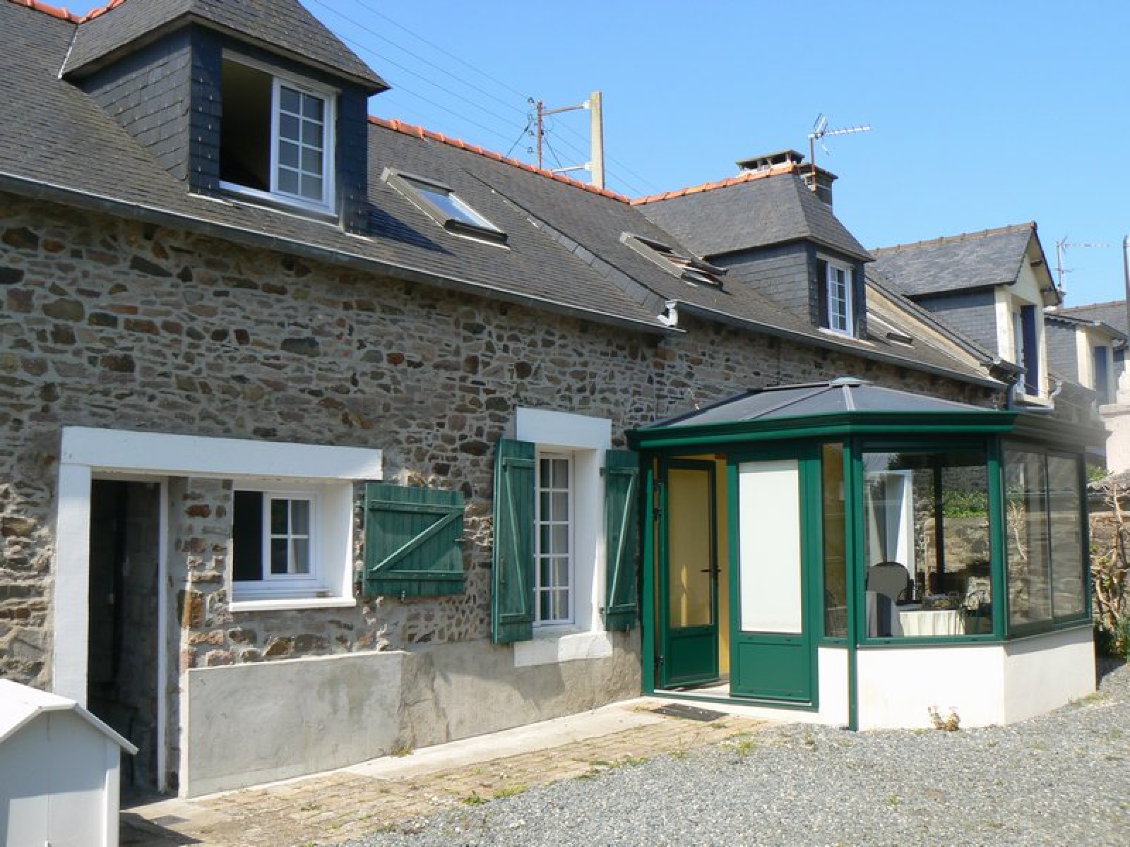Maison de pays en pierres sous ardoises située au calme. Le rez-de-chaussée se compose d'un séjour salon avec cheminée, une cuisine aménagée, une salle d'eau et WC, à l'étage vestibule avec placards desservant trois chambres dont deux attenantes, un cabinet de toilette, une buanderie. ,Un garage en pierres sous ardoises prolongé par un atelier est édifié sur le terrain. Il peut être aménagé. ,Très beau terrain arboré de 2520 m2 avec verger.